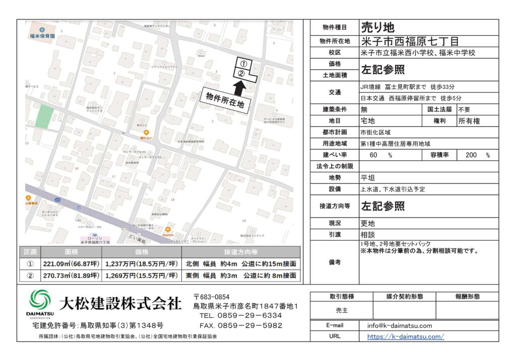 米子市西福原7丁目にて土地を販売中です。