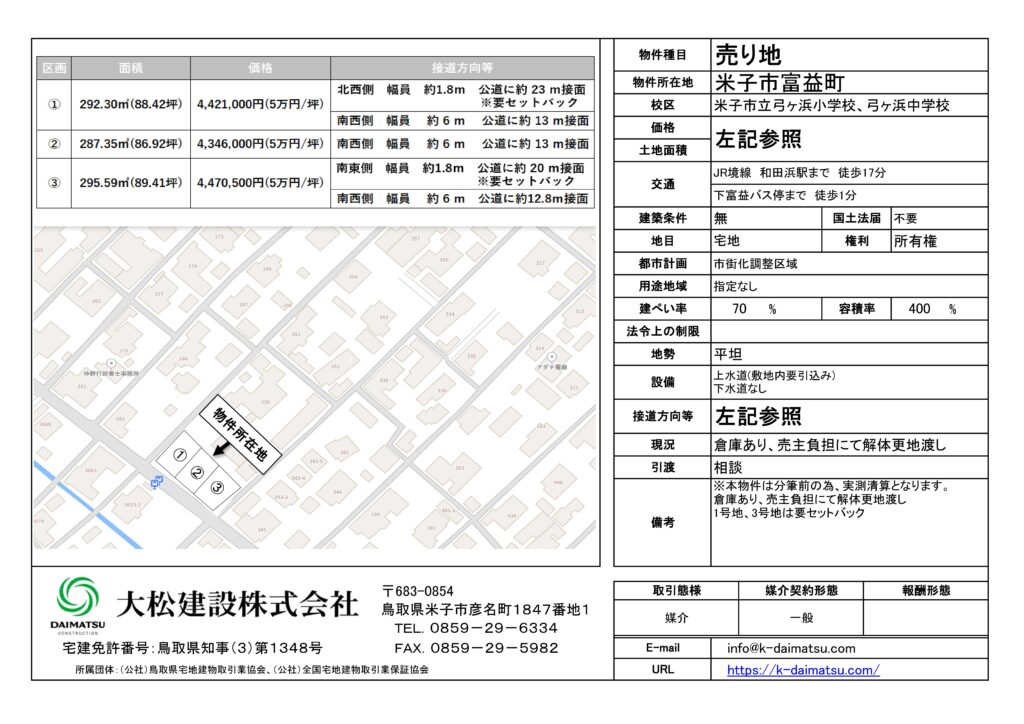 米子市富益町の土地を販売させていただくこととなりました。